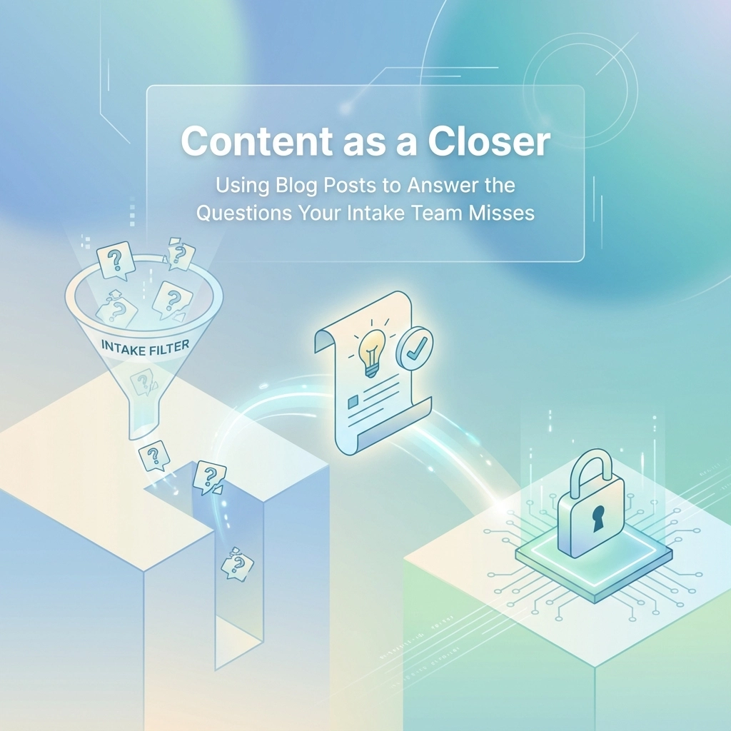 That's where strategic content marketing comes in. The right blog posts don't just drive traffic; they function as silent sales tools that work 24/7 to address the questions your intake team never gets asked directly.